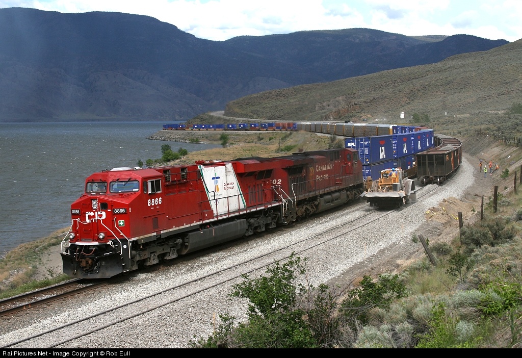 | It is raining over Kamloops Lake as CP 8866 West catches the last rays of sunshine after passing the work train. After 8866 clears, it will be pouring rain on this side of the lake and the work train will resume dumping ballast. |