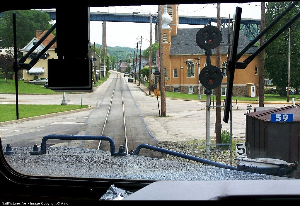 CSX AC4400 397 waits at a red signal at the south end of the street running section in West Brownsville PA