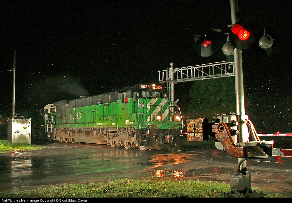 It's raining cats and dogs, it's pitch black outside; time to watch a movie with the girlfriend/wife... NOT! With the aid of Ziploc bags over the flashes, here is MMA #1 flying by at 30 mph towards Montreal. Many drops of rain are visible because they reflect the light of the flashes! Many viewers had concerns for the crew being blinded by the flashes. Rest assured that no one was at risk during the shooting as the multiple flash setup had a minimum distance of 30 feet from any part of the train and are of the 4 "AA" batteries type (not the strongest), a distant lightning would be a fair comparison . In fact, the original picture was underexposed quite a bit, I had to correct it afterwards. To top it off, many MMA employees know me and what I'm doing. 15 seconds before the arrival of the train, I trigger my flashes manually to make my presence known... ;-)
