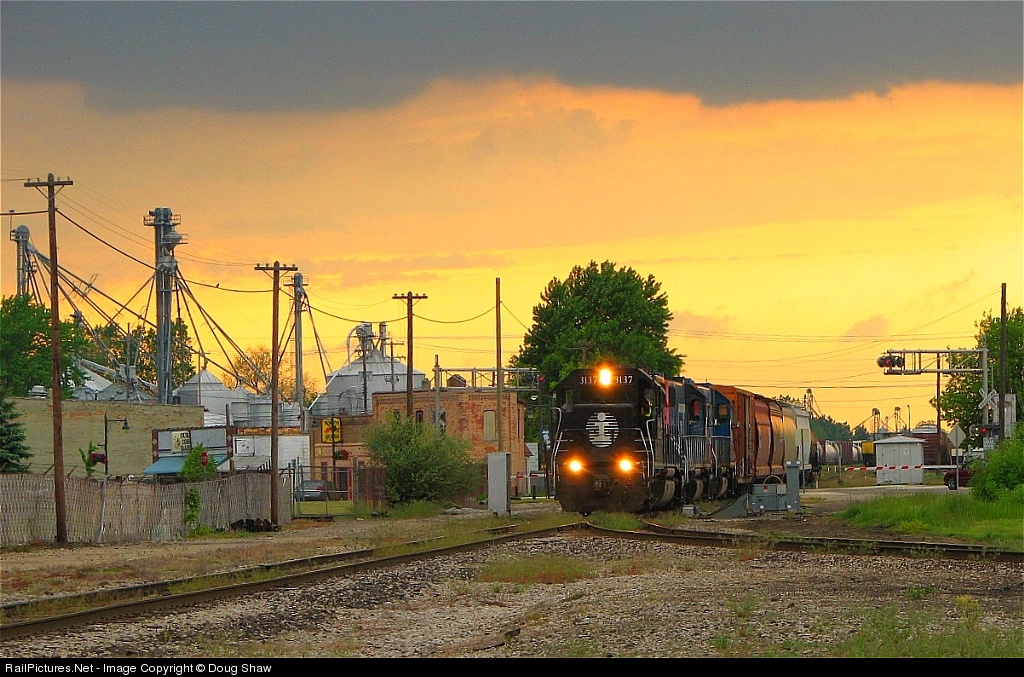 | After setting out, CN/GT train 292 departs Durand Yard as a beautiful midwest sunset heralds the last light of an otherwise cloudy, rainy day. |