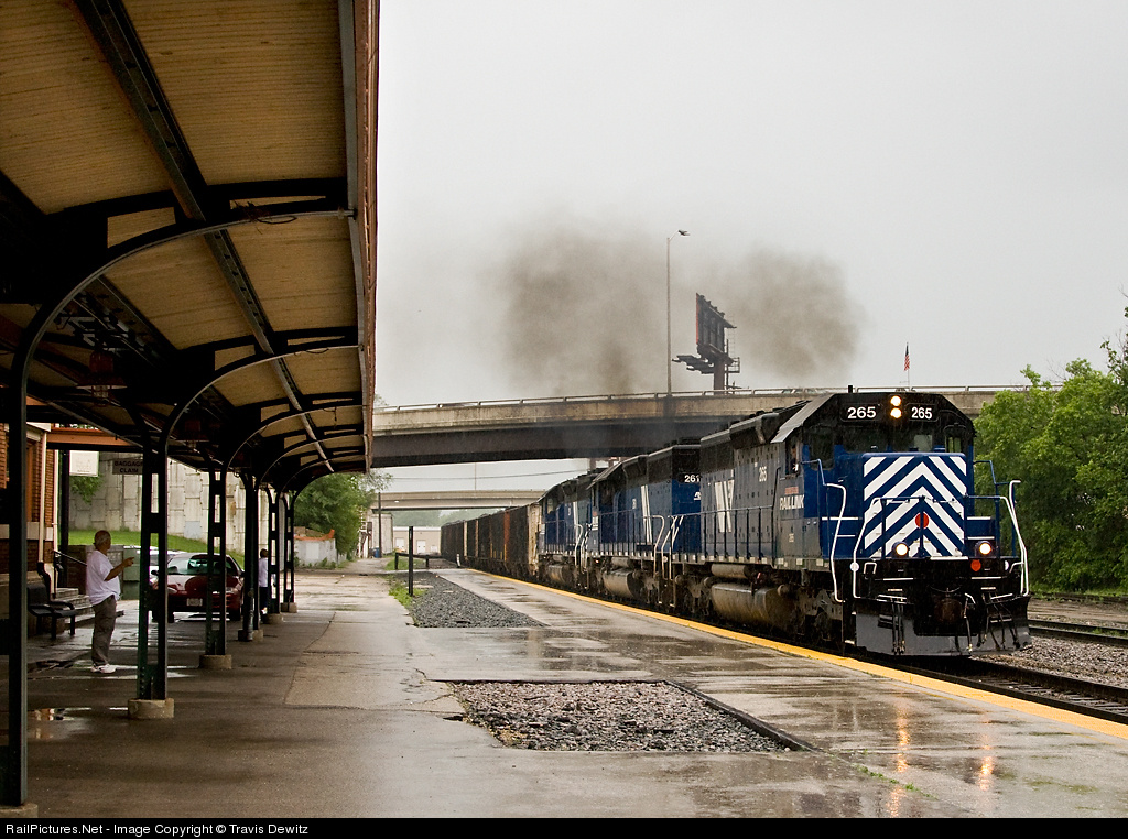 | Three Montana Rail Link units power up as they pull their coke train East through the pouring rain past the La Crosse, WI Amtrak station. This rain has caused slight flooding all over the area. The passengers that are standing outside are all waiting for their Amtrak ride, which is running over three hours late. |