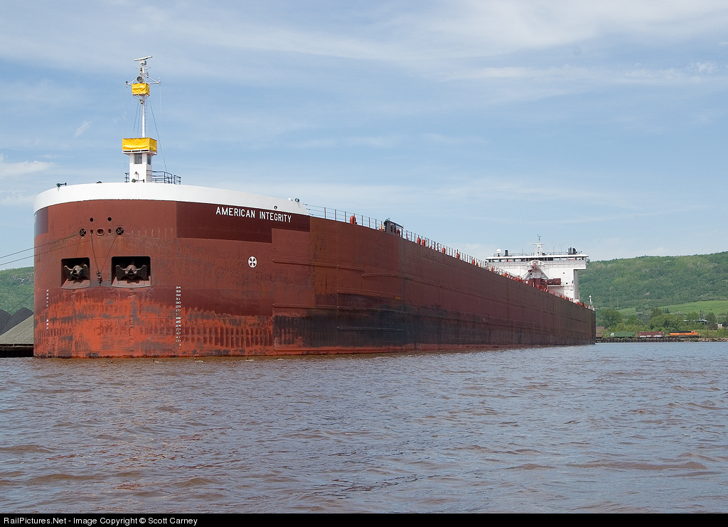 Trains are big but they are dwarfed by the boats on the Great Lakes. A 54-car Duluth transfer passes the 1,000 foot American Integrity, docked at Hallet Dock #5.