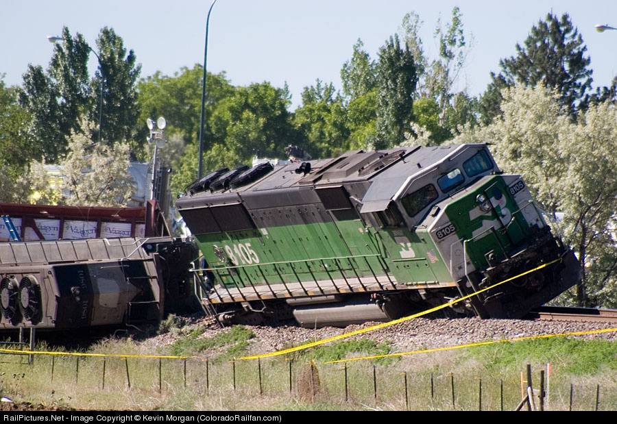 Around 10:30pm the night before, BNSF's Longmont Turn struck a tree stump deliberately placed on the tracks. The lead unit, BNSF 8105, somehow managed to stay mostly upright.