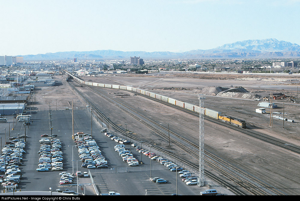 | Things were a bit different in Las Vegas 16 years ago as an eastbound auto train from Mira Loma CA passes through the old yard. Photo taken from the Union Plaza hotel. |