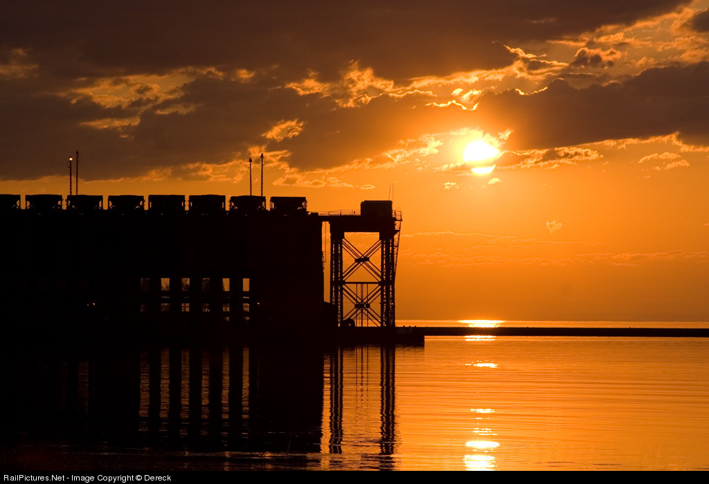 Ore cars await the arrival of the next vessel as the dock job drills cars on the other side and the sun rises.