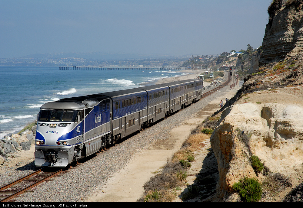A SB Amtrak Pacific Surfliner skirts the Pacific Ocean on its way to San Diego from LA. When we saw the headlight in the distance, we thought it was ATSF 3751 since it seemed about the right time when we looked at our cell phones. 3751 was running ~15 minutes behind the Amtrak.