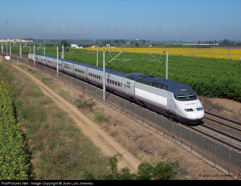 High Speed Train at 250Km/h, destiny Madrid Puerta de Atocha, and proceeding of Seville Santa Justa, in your pass for Brenes. These trains are being reformed internally, in the photography, already by the made reform.