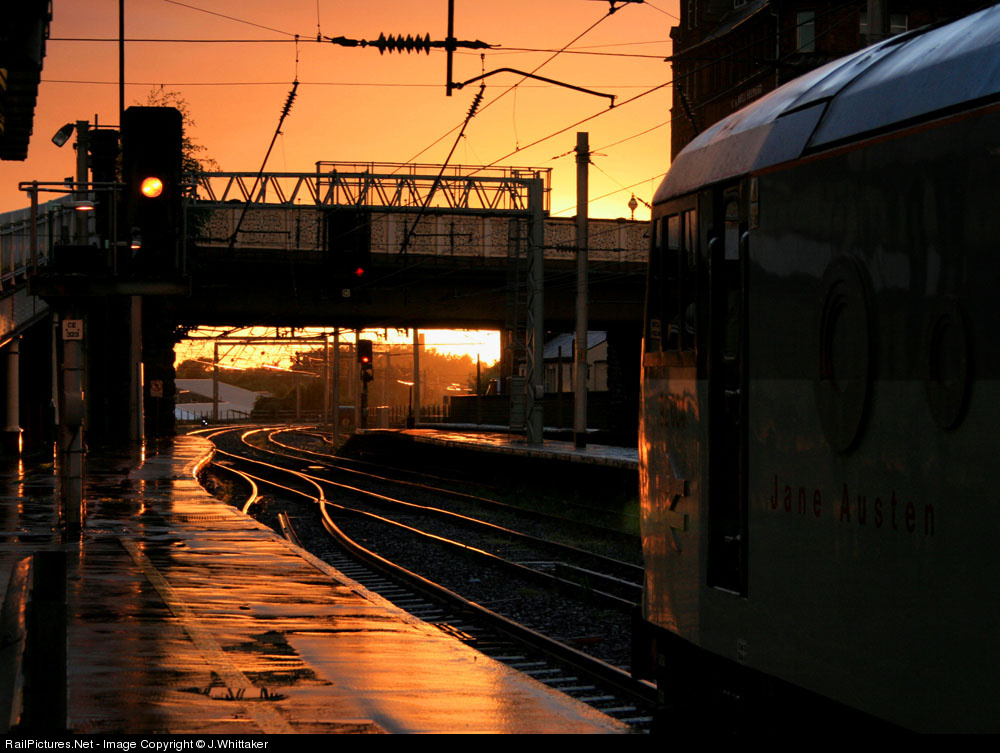 | 92004 "Jane Austin" gets the road out of Carlisle station with a scottish bound freight just as the last rays of sun go down. |