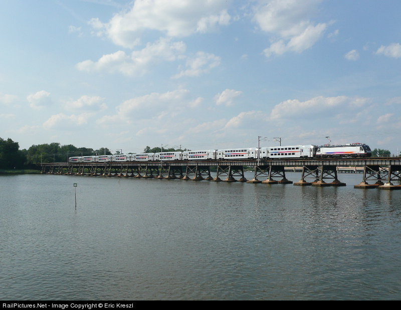 NJ Transit ALP-46 #4610 pulls a Westbound Multi-level train over the Navesink River Bridge into Red Bank NJ on NJ Transit's North Jersey Coast Line. Multi-Level Trains are becoming more common on the North Jersey Coast Line. This photo appears on the back cover of the August 2008 issue of Railpace Newsmagazine.