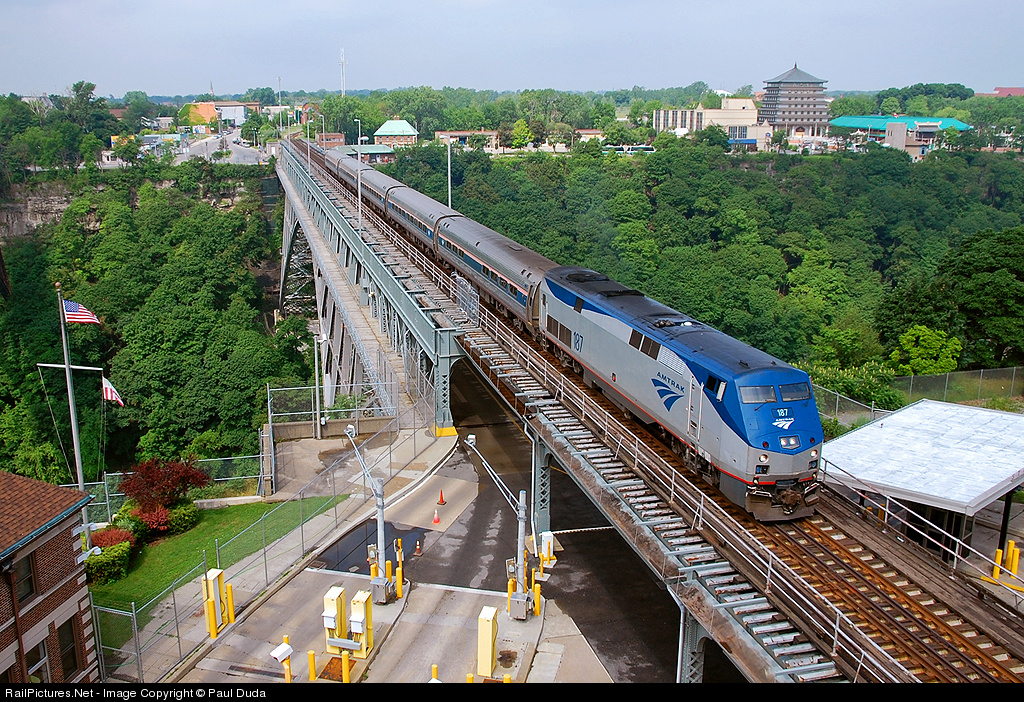 Amtrak 64, the Maple Leaf, heads over the Whirlpool Bridge as it leaves Canada and enters the United States. Amtrak is the only railroad to use this bridge anymore, as CN is the owner. Amtrak runs on the upper level, while cars (that are part of NEXUS) use the lower level. VIA Rails station is right on the other side of the bridge as the sign is visible in the photo.