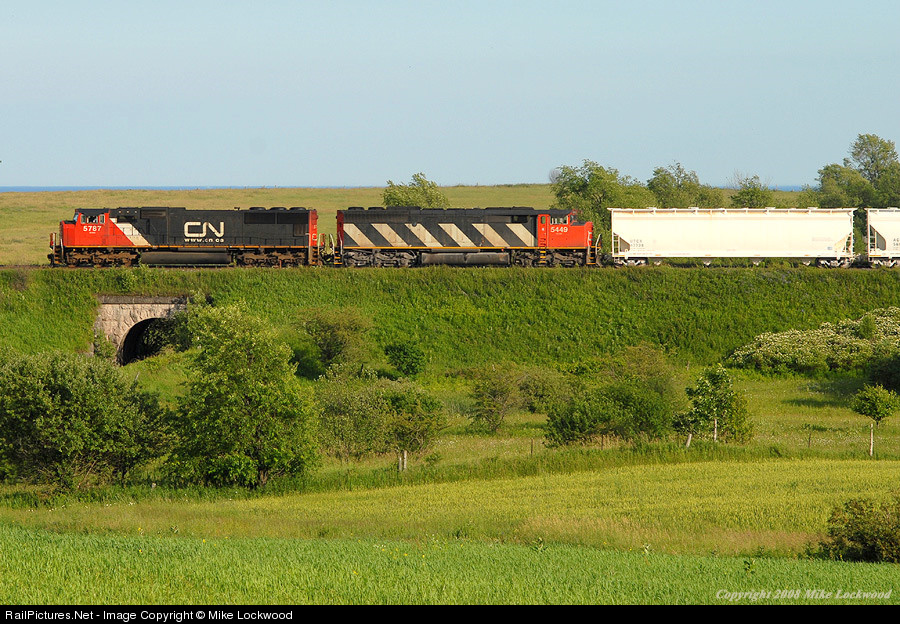 Cruising east with a short train, CN 5787 and 5449 make 39 MPH through the peaceful countryside at Newtonville, Ontario. This was the last summer for SD50F 5449 as she was retired on October 27, 2008. Though the 50 series were problematic locomotives, at least 5449's paint has held up very well since last being applied in the early 1990's. 1843hrs.