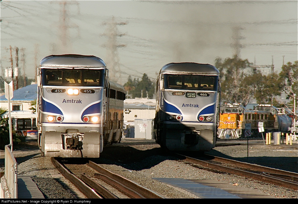 | A northbound Amtrak Pacific Surfliner approaches the Anaheim Amtrak depot southbound as a northbound Surfliner departs north. In the distance, the UP Costa Mesa local awaits to enter the SCAX Orange Sub to head south to Santa Ana. |