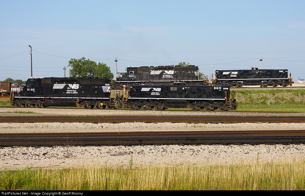 | The only SD38-2 on NS along with slug 861 climb the hump in the background, with SD40-2 6190 and 860 sit waiting for their next assignment. |