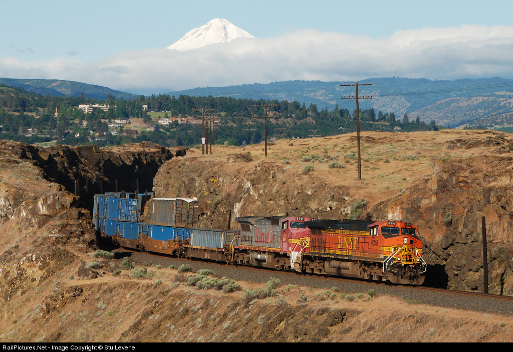 | With the majestic Mount Hood in the distance, an eastbound stack train makes its way towards Pasco, under the Route 197 bridge. Those ex-Santa Fe 'Warbonnets' are looking increasingly shabby these days...time for a re-paint? |