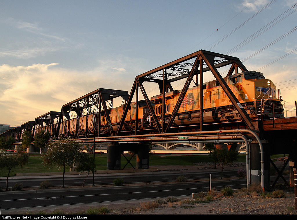 | The 96 year old trestle never looked better than at sunset. UP 7832 crosses Town Lake at the sunbathing section with an SD70M right behind as they head to the UP mainline south of Phoenix. Beach, water and a train, but not a bikini in sight.. . My other photos are here! |