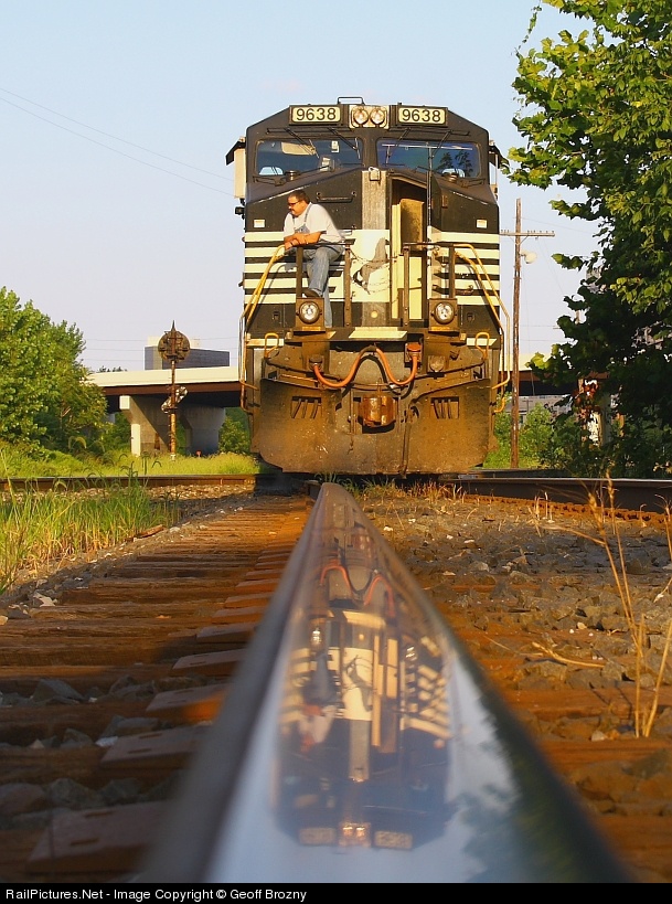 A reflection of NS 117's lead engine, and its engineer in the rail, as NS 117 went in emergency on the Hocking diamond, a CSX car air hose failed, which ended up blocking traffic on not only NS, but the CSX Columbus line sub, and the CSX Columbus sub for a couple hours.