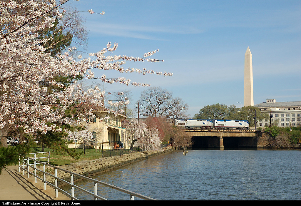 Amtrak 41 and 17 head the northbound Crescent past the Tidal Basin and the Washington Monument amongst this years cherry blossoms.