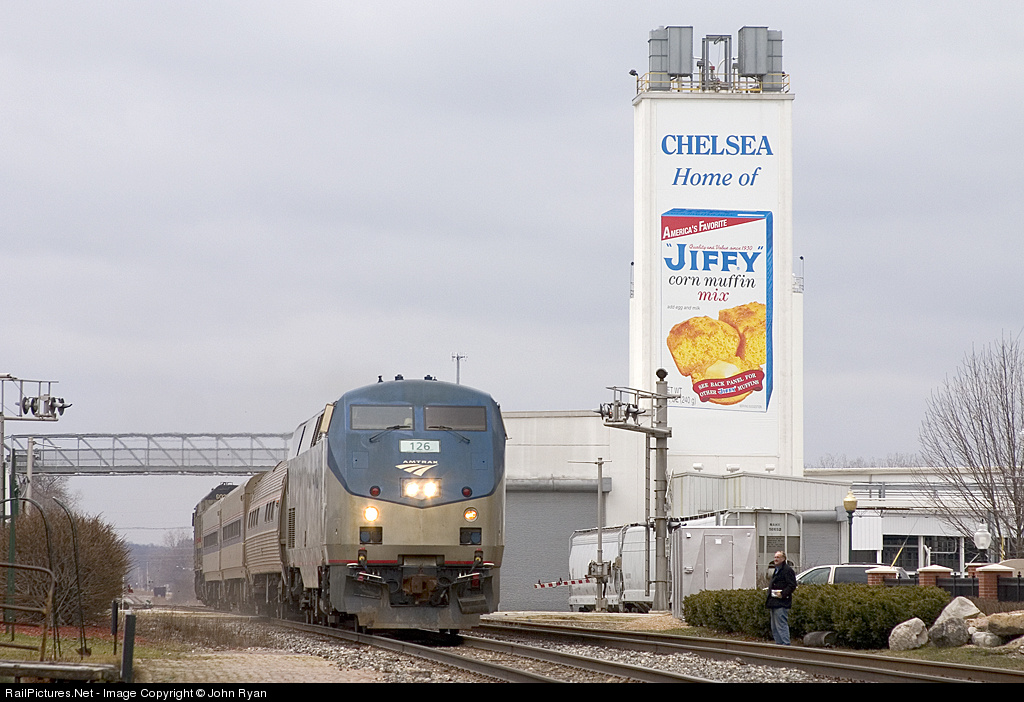 | Amtrak blasts past the Jiffy Milling company in Chelsea, Michigan. This is where your corn muffins come from. Jiffy is probably one of the largest (and only) customers left on the NS Michigan Line. |