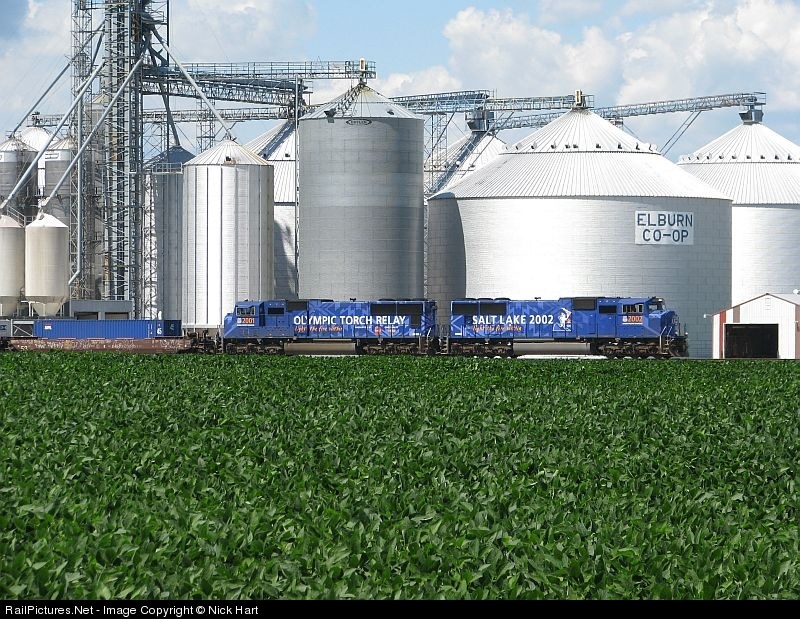 On a rare coincidence, one day before the Olympic's opening ceremony in Beijing, UP's two Olympic SD70M's (2002 and 2001) lead an eastbound freight through Elburn, Illinois.