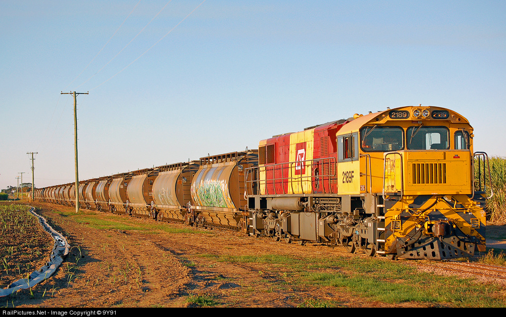 QR DEL 2189F sits in the dual gauge line on the Kalamia sugar line and waits with 6J63 loaded bulk raw sugar train bound for Townsville jetty.