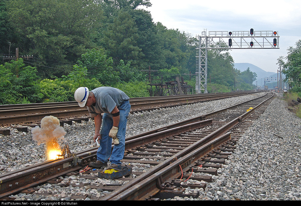 A CSX Signalman bonds wire to rail. In the background, new signals are being tested. The interlocking tower there is being closed, and all dispatching will soon take place from Huntington, WVA