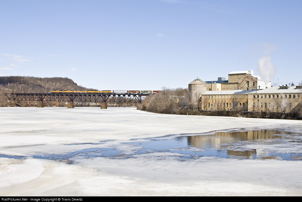 Five locomotives pull their train West across the Chippewa River from behind the Cascade Tissue Paper Plant.