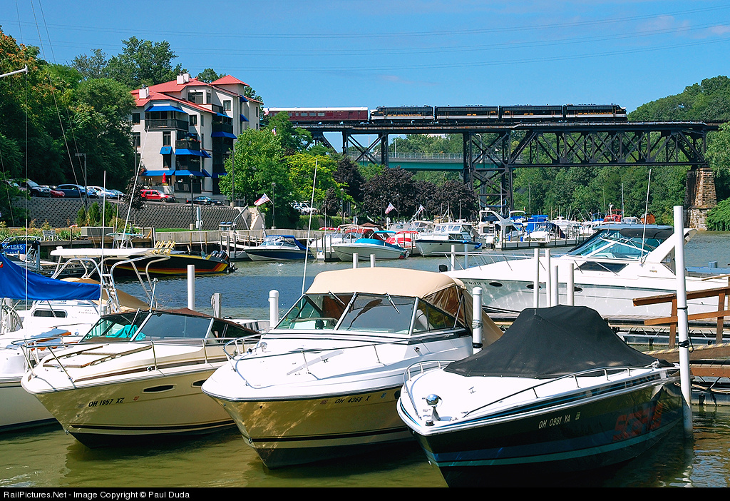 | The NS OCS takes to the ex-NKP line for the first time and is shown departing Rocky River after picking up some passengers. Here it is headed east over the Rocky River and Cleveland Yacht Club. While daylight photography is uncommon on this part of the line, in the last month NS has been rerouting traffic here due to the Beaver River Bridge replacement, making this photo possible as there would otherwise have not been a drawbridge operator in Lorain to let the train through until later in the day. |