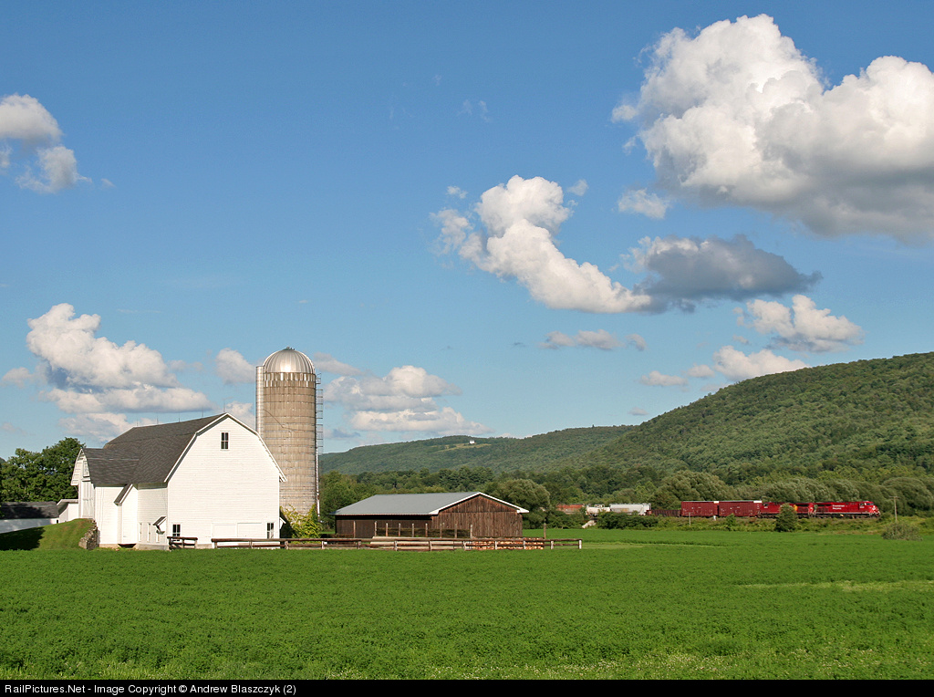 | The silence on this farm is broken although not by a herd of cattle or galloping horses, but a mile-long monster with the power of 4400 horses combined. CP 8828 leads train #252 south through the village of Maryland, NY on a picture-pefect summer afternoon. |