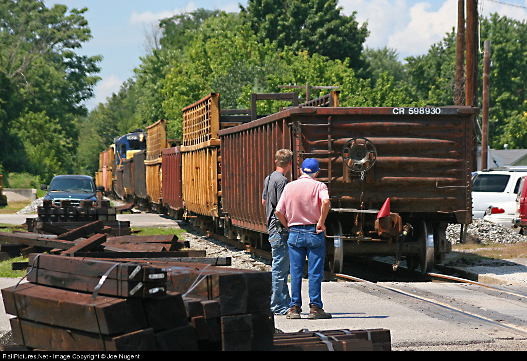 | A CSX employee does his best to safely walk his train thru the crossing while still fielding questions from a local about all the recent activity on this once nearly abandoned line. Wonder how he took the news that soon 2-3 50 car rock trains a week will |