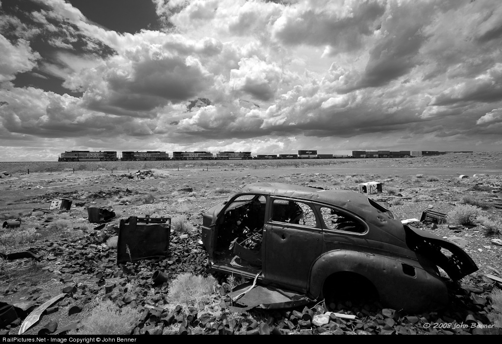 Under threatening skies a BNSF train rolls by a junked car west of Winslow.