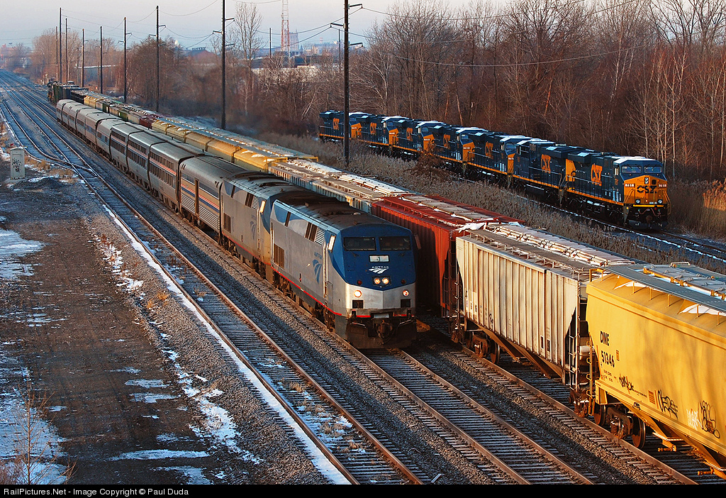 The Lakeshore Limited passes Q393 and a string of seven new CSX Gevos awaiting pickup from the GE plant in Erie, PA.