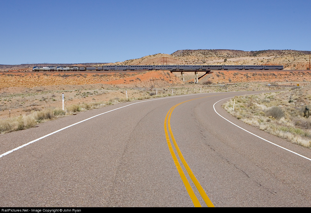 Westbound Southwest Chief is on the advertised as it races through the desert at Rosario, NM. Unfortunately, both locomotives failed in Albuquerque, which was not surprising given the oil that was freely flowing down both sides of the second unit. And true to Murphy's law, the protection power in Albuquerque promptly failed when attached to the train. The whole mess was tied together behind two blue lease-fleet GP38's, where it left town without HEP and at restricted speed.