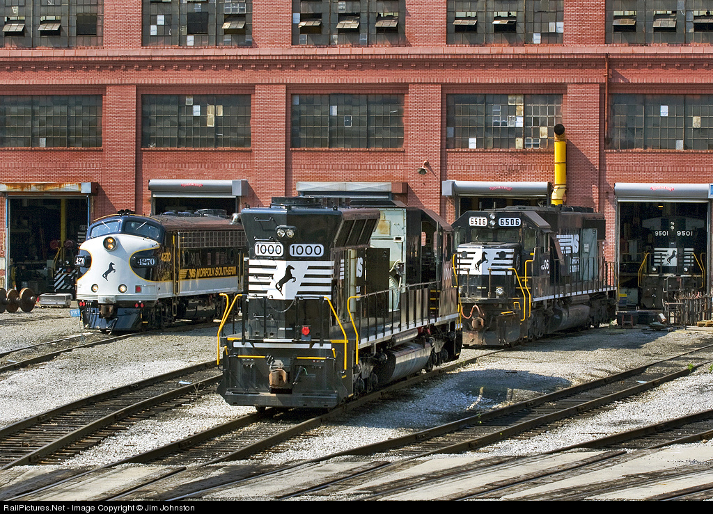 | The unique NS test bed NS 1000, the former Erie Lackawana 3632 and Conrail Q1 sits behind the shops in Altoona. Also visible in the photo is the NS F unit 4270 getting ready before its next run on the OCS as well as two other engines. |