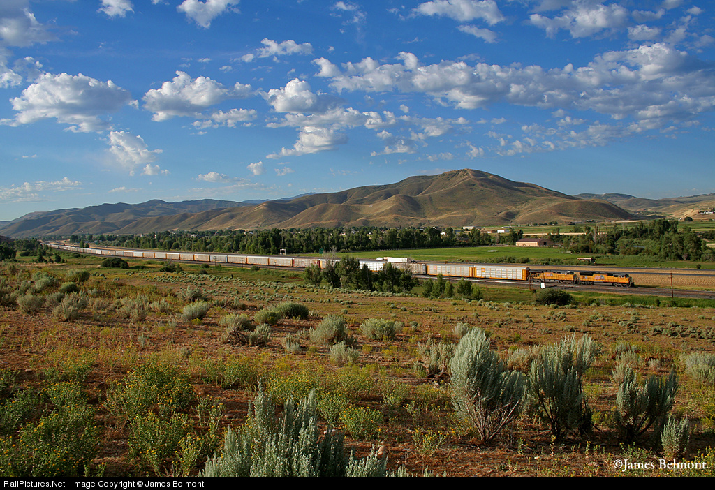 | On a cool summer morning, UP's Cheyenne to Provo auto train rolls west down the Evanston Sub near Henefer. A portion of this train will be set out at Roper Yard (SLC) with the remainder headed south to Provo and west to Las Vegas on the MPVVL-24. |