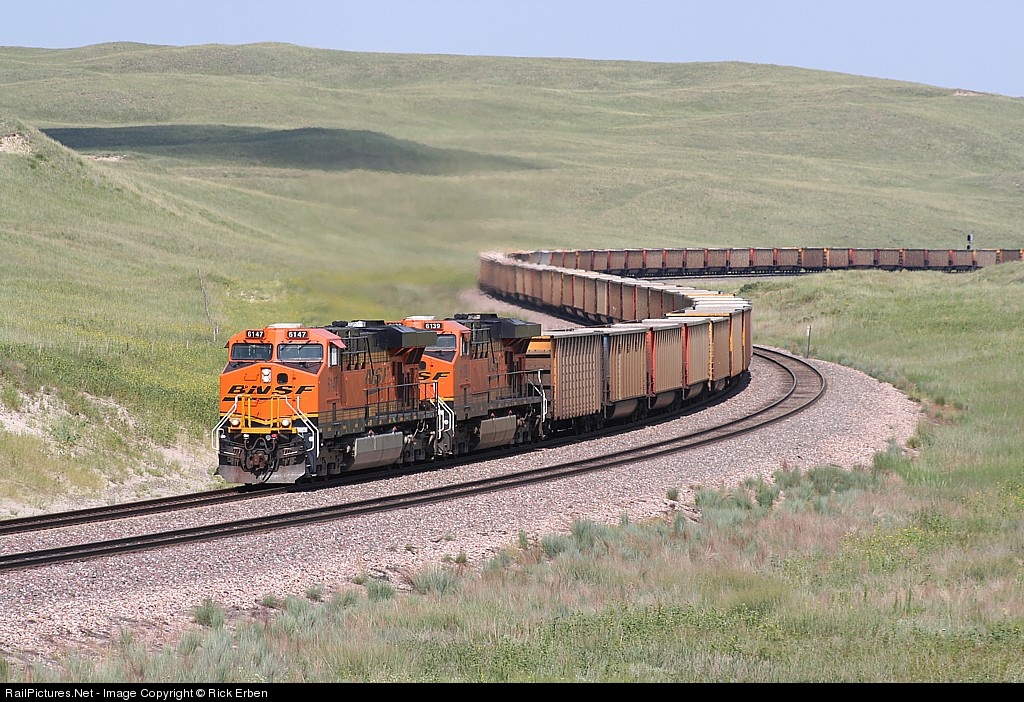 Westward empty hoppers behind BNSF 6147 glide through an S curve west of Mullen in the vastness of the central Nebraska sandhills. Once a rural CB&Q branch, this line is a coal thoroughfare; whereas the old C&NW Cowboy line, some fifty miles to the north, didn't fare so well and is abandoned.