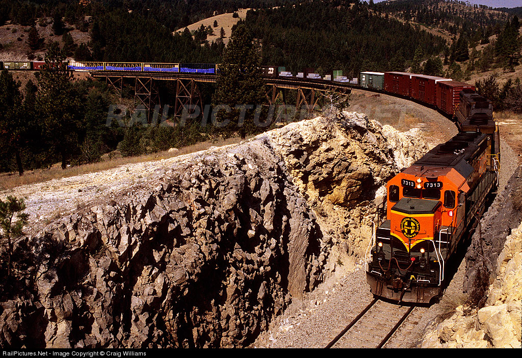 | A eastbound BNSF freight train coast downhill towards Helena. This eastbound is about 2 miles east of Mullan Tunnel as they cross over the trussel that just east of the well known Skyline Trestle. This consist has changed quite a bit in 8 years since this photo was taken. Both SD45-2B's are gone off BNSF roster, and the 7300's are getting renumbered into the 6900's series. |
