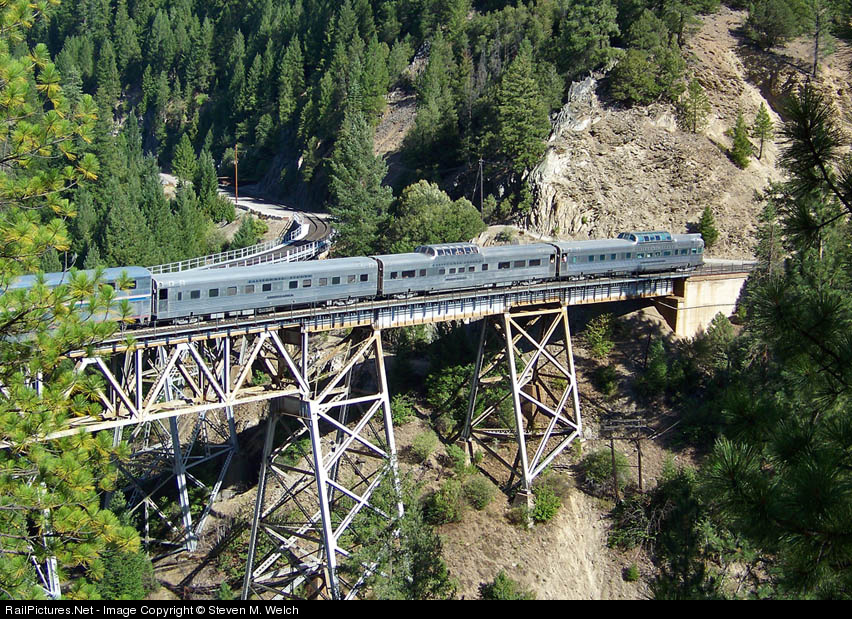 | The old California Zephyr crosses the famous Keddie Wye... NOT!!! Amtrak #5 has detoured for the 2nd time, and this one is special. Three ex-CB&Q cars (Silver Rapids, Silver Lariat and Silver Solarium) bring up the rear, in a scene that could have been seen in 1970. |