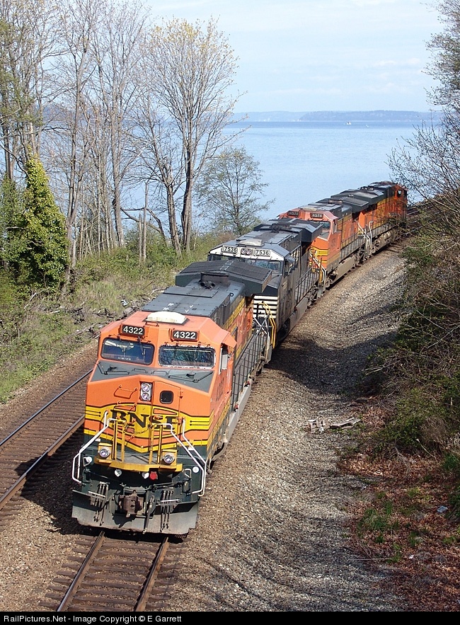 | Four Dash-9s (one a visiting C40-9W from the NS) work light up the shoreline trackage from Seattle to Everett. The park access bridge was erected to address safety concerns but provides a boon for railfan photographers. Thanks. |