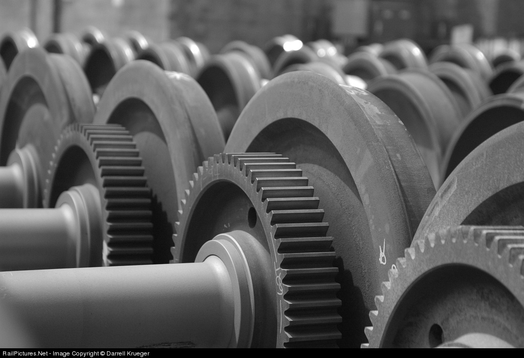 Many, many locomotive wheelsets, complete with bull-gears, stand outside of the shops at Livingston.