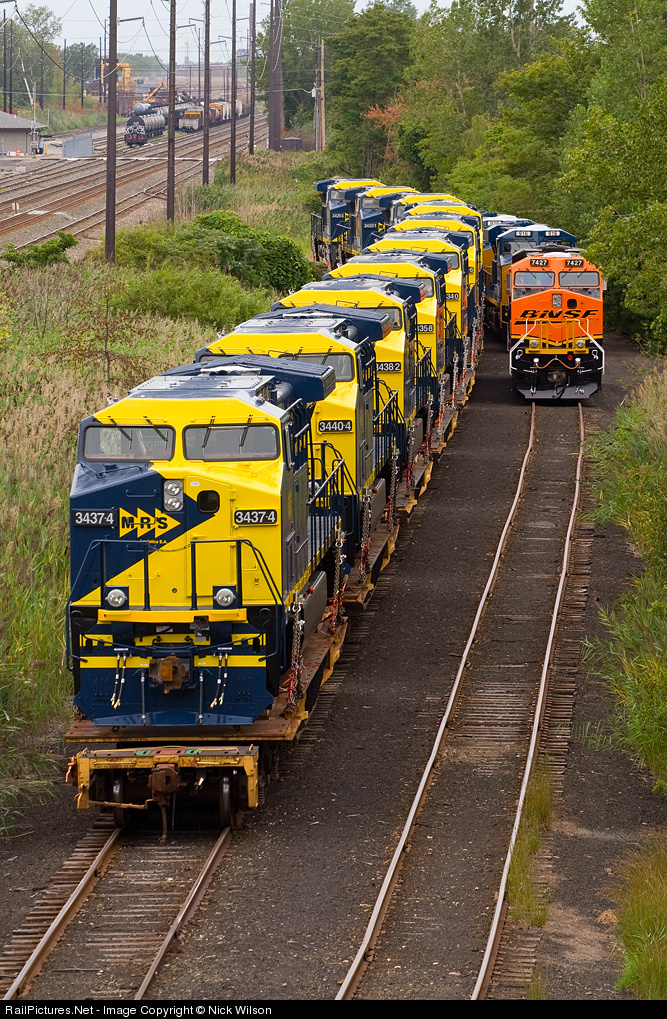 10 new MRS AC4400CWIs sit at the CSX-GE interchange, along with BNSF ES44DC #7427, and CSX ES44AHs #916 and #920.
