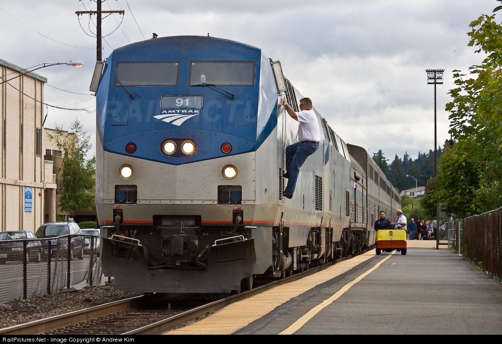 Amtrak Empire Builder #7 arrived at Edmonds about 10 minutes late. A relief crew climbed onboard on AMTK 91. AMTK 91 was overhauled with a "bolt-on-nose" installed on the front of the locomotive.