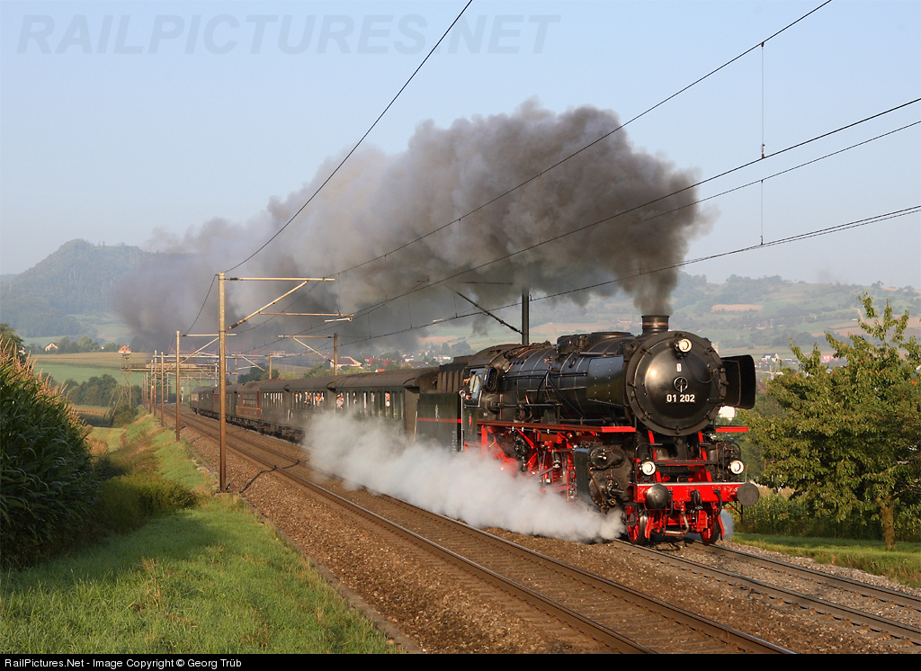 | With a 9 car train of about 360 tons the ex German Pacific 01 202, based in Lyss/Switzerland, is tackling the 1.4 % grade of the Bözberg on a beautiful morning. The "Nostalgie Rhein Express (NRE) of the Eurovapor was on the way to Rapperswil via Brugg-Zürich Seebach-Winterthur-Wil-Wattwil-Uznach. |