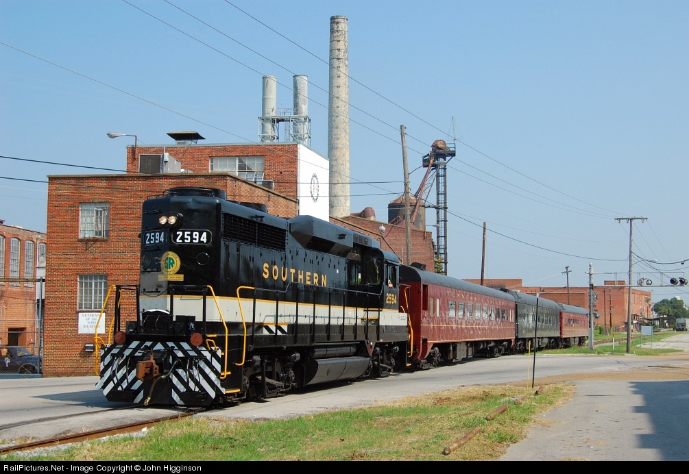 | Running long hood forward in traditional Southern style, the 2594 leads one of TVRM's Chickamauga Turn excursions through the Chattanooga suburb of Rossville. This unit is owned by SERM in Duluth, GA and was refurbished at TVRM's Soule Shops. |