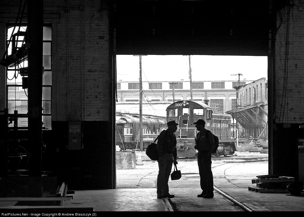 Two DL&W employees have a quick chat as yard goat SW8 500 sits quietly in the background waiting to shuffle things around the Lackawanna's busy Scranton Back Shops. Oh, if it were only 1955 again! In reality two Steamtown employees shoot the breeze as museum piece, DLW 500 (Wabash 132), sits forgotten and alone behind the shop building.