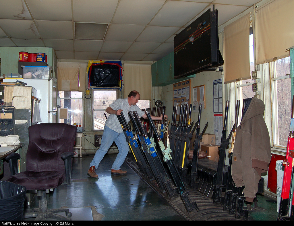Tower operator Will Goff gets into the armstrong lever at the 106 year old Keyser Tower. "Z" Tower and Will both retired August 4th of this year. The interlocking is now handled by a Huntington dispatcher, and the tower sits unused, waiting for demolition.