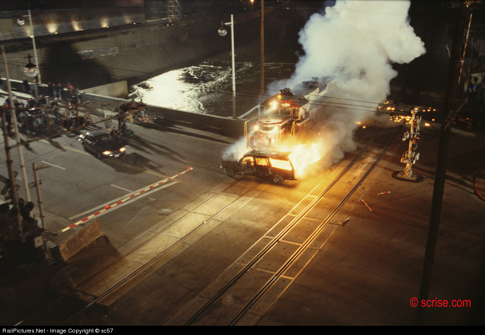 Movie stunt train for Lethal Weapon 4 shot on location in Downtown Los Angeles on North Main Street at the L.A. River and Union Pacific crossing. Note the “fake” crossing gate mounted to the pavement in the right hand side of the frame. The talent and production crew are at safe distance on the bridge. © www.scrise.com