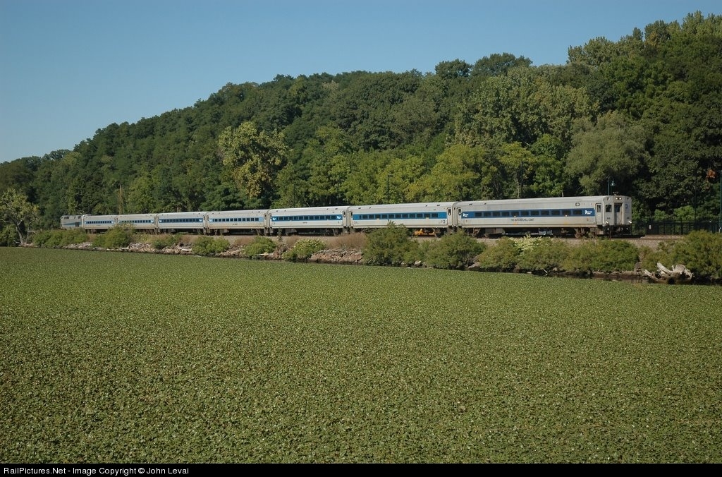 A Metro North Poughkeepsie-GCT bound train approaches the Beacon station on Labor Day of 08 at about 3:50. This shot was taken from a park along the Hudson River. The second car behind the cab car is a refurbished Shoreliner, that saw duties on the New Jersey Transit L