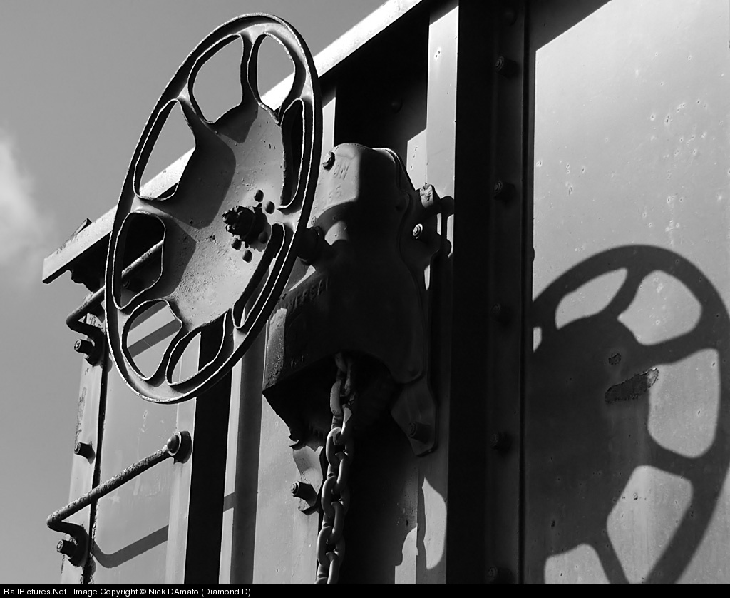 The brake wheel of an NS coal hopper, sitting patiently on a spur over the weekend waiting to be picked up.
