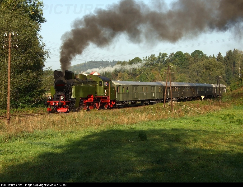 Polish made steam loco 2-8-2 class TKt48 after routine repair with historic passenger and post cars. Special train from Chabowka to Mszana Dolna for rail fans.