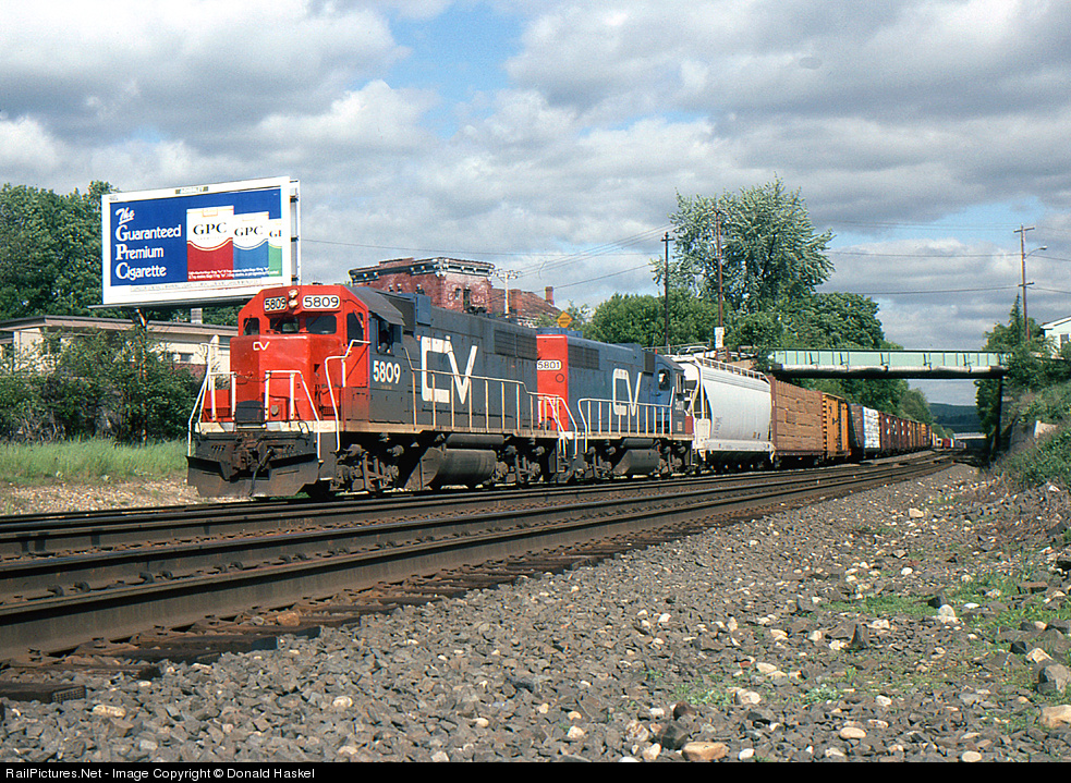 The afternoon drag from the CSX is heading up the northbound track before backing into the CV yard. This unit looks pretty good considering it was almost totaled in a wreck in 1990. No information to indicate whether or not a new unit was assigned the number 5809.